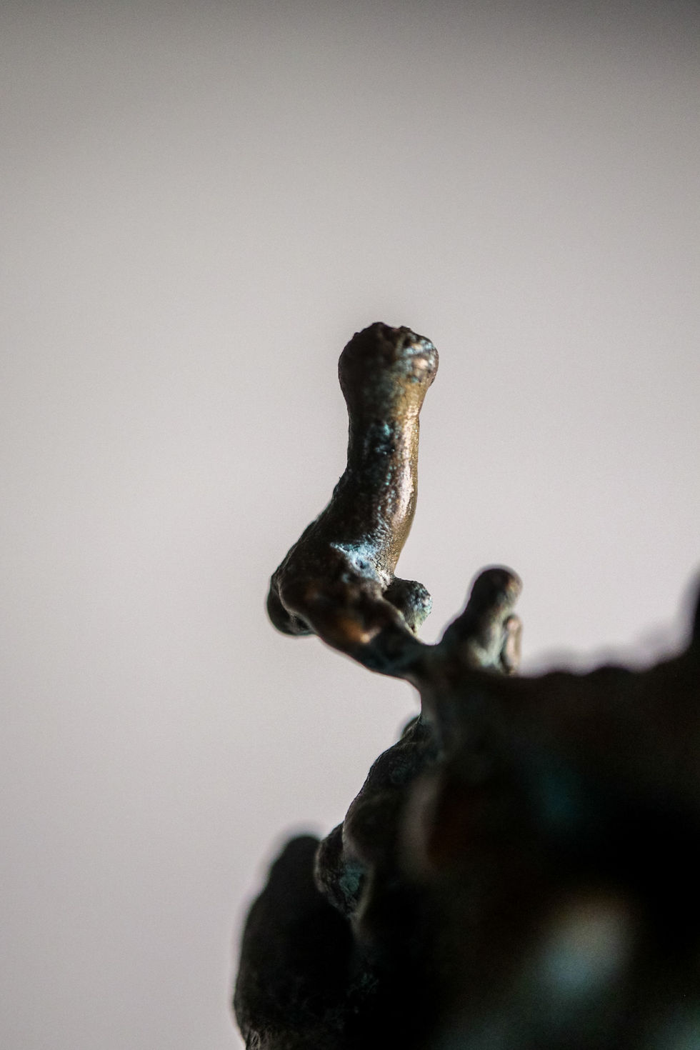 This bronze mushroom sculpture represents a stylized member of the Stropharia family, with a tall, slightly curved stipe rising from a rough, mycelium-like base and supporting a broad cap under a glass dome. The cap shows pronounced radial gill-like striations and irregular, somewhat split margins, while subtle blue-green patina on the cap and base evokes the moist, saprotrophic habitats where Stropharia species typically grow.